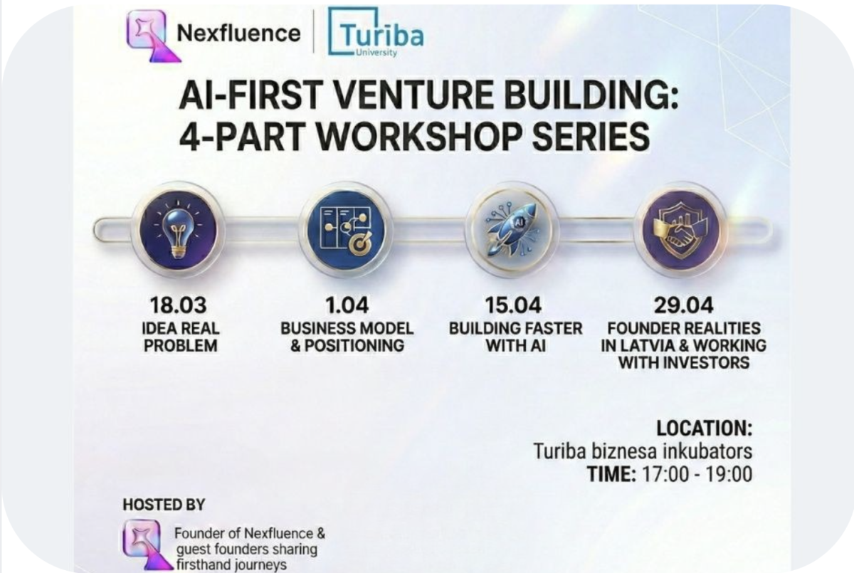Turiba University Business Incubator, in collaboration with Nexfluence, invites students and aspiring founders to join an intensive 4-part workshop series designed to turn ideas into investor-ready ventures using AI tools and practical startup frameworks.