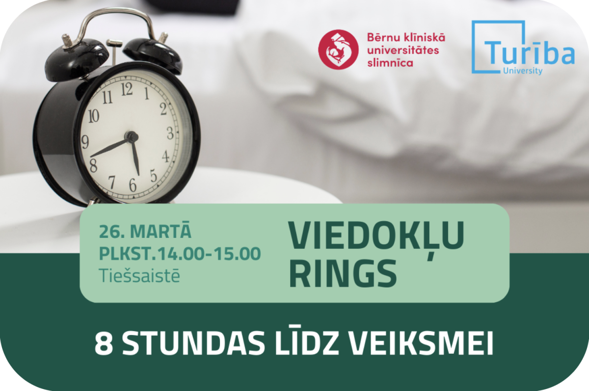 Starptautiskā miega mēneša ietvaros 26. martā plkst.14.00-15.00 tiešsaistē Biznesa augstskolā Turība notiks viedokļu rings - paneļdiskusija “8 stundas līdz veiksmei”, kurā eksperti akcentēs miega būtisko ietekmi uz jauniešu fizisko un mentālo veselību, mācību sasniegumiem un ikdienas labsajūtu.
