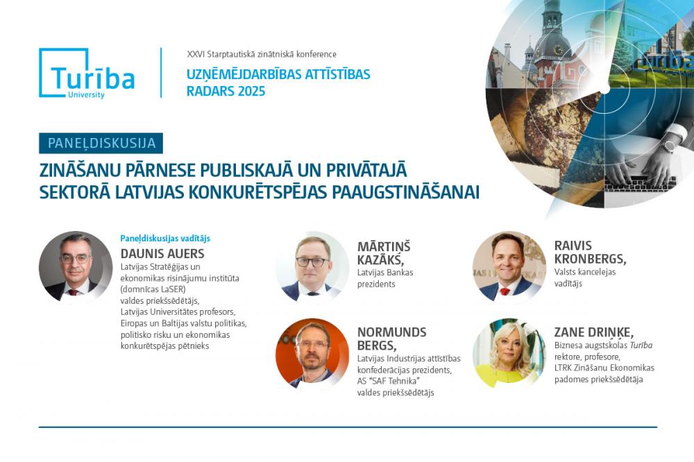 Lai diskutētu par privātā un publiskā sektora sadarbību zināšanu pārnesē Latvijas konkurētspējas paaugstināšanai, 19. martā Biznesa augstskolas Turība starptautiskajā zinātniskajā konferencē “Uzņēmējdarbības attīstības radars 2025” notiks ekspertu paneļdiskusija.