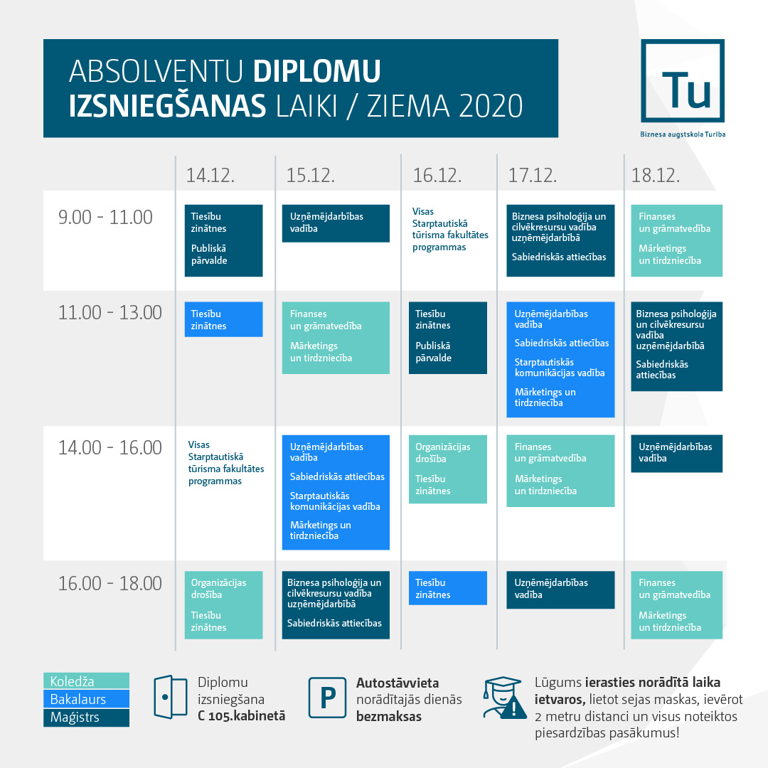 Ņemot vērā, ka svinīgā ziemas izlaiduma ceremonija ir pārcelta uz vēlāku laiku, kad tiks atļauta pulcēšanās bez ierobežojumiem, Biznesa augstskola Turība informē par datumiem un laikiem, kad diplomus var saņemt tie 2020. gada ziemas absolventi, kuriem diplomi nepieciešami jau šobrīd.