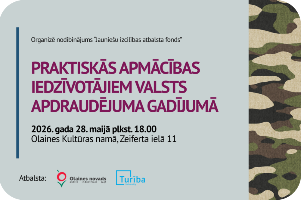 Lai paaugstinātu sabiedrības gatavību reaģēt ārkārtas un krīzes apstākļos, 2026. gada 28. maijā plkst. 18.00 Olaines Kultūras namā, Zeiferta ielā 11, norisināsies praktiskas apmācības iedzīvotājiem par rīcību valsts apdraudējuma gadījumā. Pasākuma mērķis ir pilnveidot zināšanas un praktiskās iemaņas, kas ļautu nodrošināt personīgo un ģimenes drošību potenciāla apdraudējuma laikā.