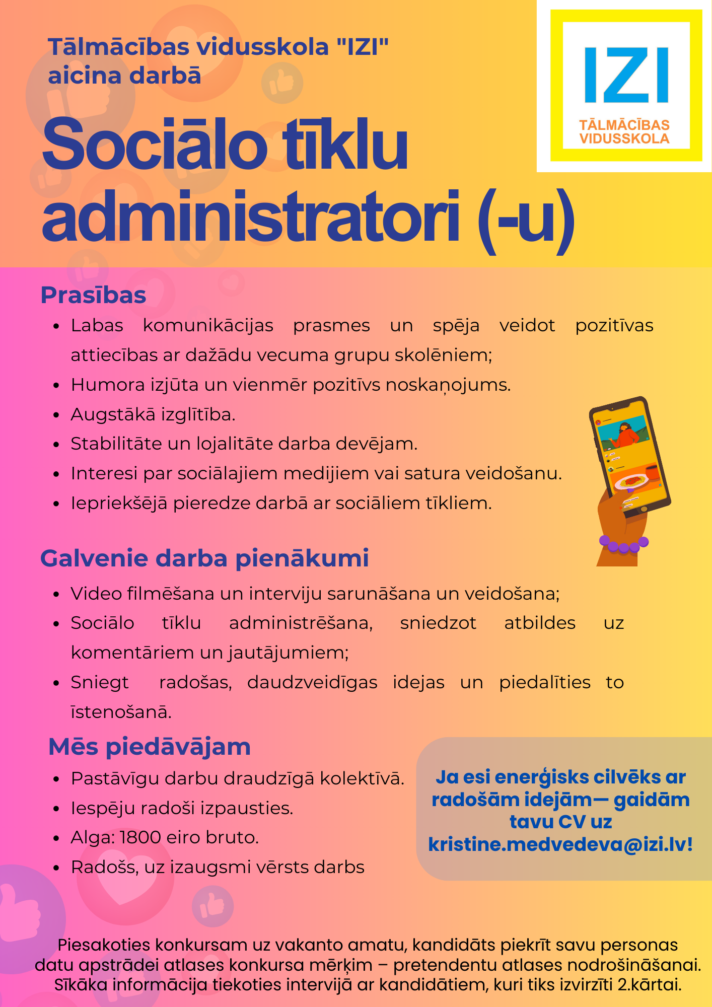 | Tālmācības vidusskola IZI | Sociālo tīklu administratoru (-i) | 7.11.2025 | - | Vairāk |